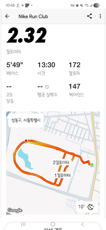 느낌상 한 5 km는 뛴 거 같은데, 고작 2.3 km 밖에 안되네. 이건 뭔가 모드 설정을 잘못한 것 같다. 다음에 뛸 때는 5 km 를 뛸 수 있는 모드로 설정을 바꿔서 뛰어봐야겠다. 그래도 인생 첫(?) 러닝이었으니, 이 정도로 만족을 하자.